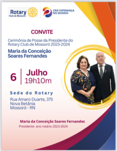 No dia 06 julho está tomando posse como a nova presidente do Rotary Club de Mossoró, Maria da Conceição Soares Fernandes. com certeza será uma linda festa. Parabéns.
