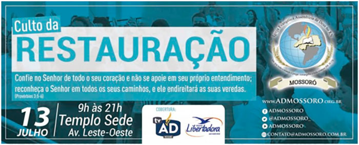 Às sextas-feiras no templo da A.D. Mossoró na Leste/Oeste, a partir das 19:00h o grande culto de Doutrina. Sempre uma palavra de orientação e esclarecimento feito pelo pastor Miranda. Em minha correria pela vida, tenho quase sempre acompanhado o grande culto e posso dizer é uma benção na vida cristã, temos alguém como o Pastor Miranda. Sempre usando, palavras de sabedoria e nos orientando na caminhada da fé. Obrigado meu pastor.