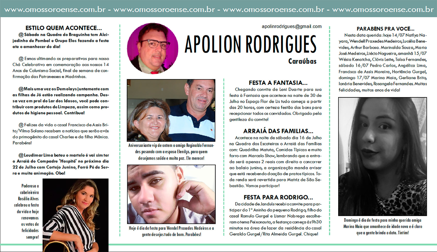 Nesta data querida: hoje 14/07 Natlya Nayara, Wendell Praxedes Medeiros, Lucélia Benevides, Arthur Barbosa. Marinalda Souza, Maria José Medeiros, Liécio Nogueira, amanhã 15/07 Wésia Kenatcha, Clóvis Leite, Taísa Fernandes, sábado 16/07 Pedro Carlos, Angélica Lima, Francisco de Assis Moreira, Hortência Gurgel, domingo 17/07 Marina Maia, Gerliane Brito, Ionária Benevides, Rosangela Fernandes. Muitas felicidades, muitos anos de vida!