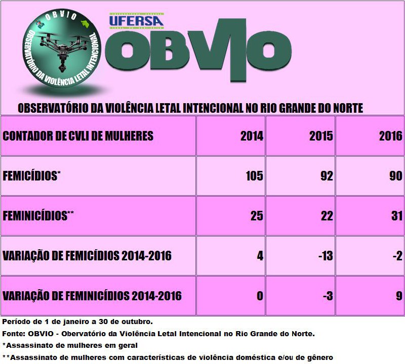 O Observatório da Violência do Rio Grande do Norte (OBVIO), assim como vem divulgando os dados quantitativos sobre a violência homicida no RN em geral, as chamadas Condutas Violentas Letais Intencionais (CVLIS), traz também os dados específicos relativos ao “feminicídio”, ou seja, as mortes violentas e homicídios ocorridos com mulheres (como elemento motivador o fato de serem mulheres e mortes de mulheres em geral).