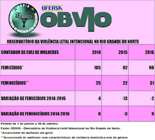Até domingo (23/10/2016) foram 90 femicídios no ano de 2016 no RN, 92 em 2015 e 105 em 2014 no comparativo com o mesmo período. Quanto aos “feminicídios”, foram 31 em 2016, contra 22 em 2015 e 25 em 2014, também no comparativo do mesmo período.