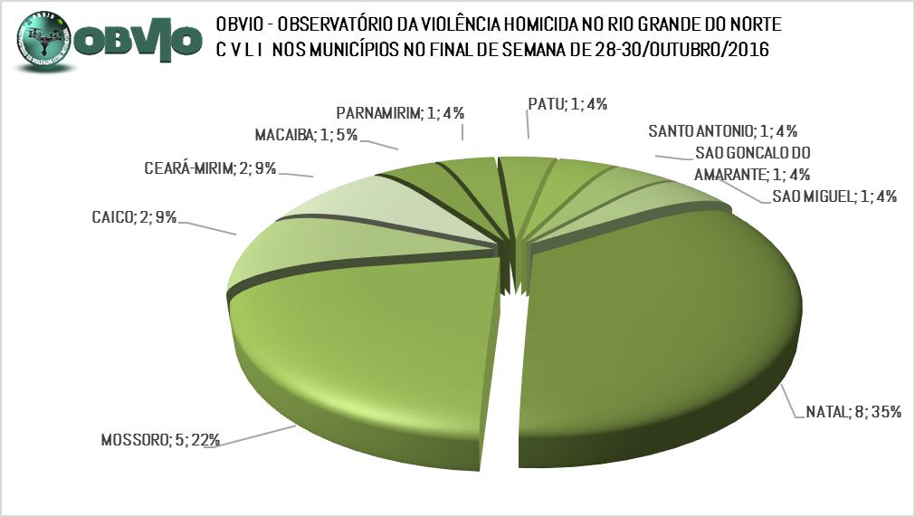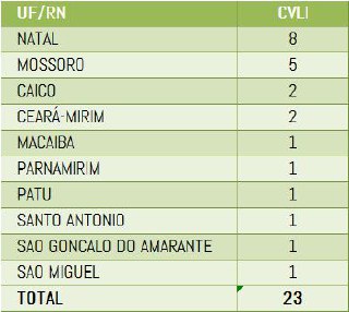 Natal registrou 8 CVLIs (35% do total) seguida de Mossoró com 5 (22% do total), Caicó e Ceará-Mirim com 2 cada (9% do total cada), seguidas por uma ocorrência em cada município a seguir (4% do total cada): Macaíba, Parnamirim, Patu, Santo Antônio, São Gonçalo do Amarante e São Miguel.