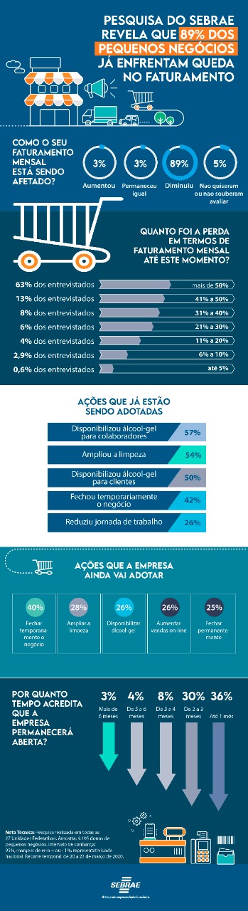 A pesquisa, feita entre os dias 20 e 23 de março, junto a um universo de 9.105 donos de pequenos negócios, revelou que, na média, a redução no faturamento das empresas foi de 69%. Os empresários ouvidos pelo Sebrae ressaltam que, mesmo adotando uma estratégia de venda online, o faturamento anual do negócio sofreria uma queda de 74%, caso as políticas de isolamento social sejam mantidas por um período de dois meses.