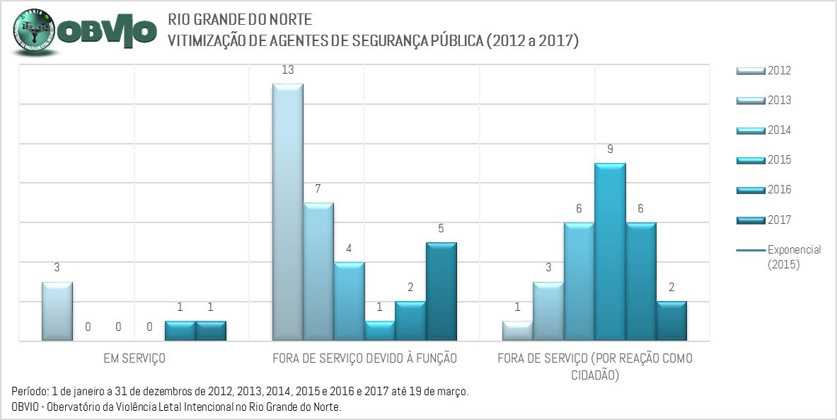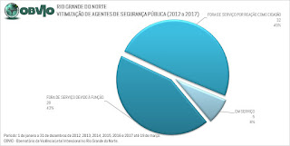 O RN contabiliza, no período de 2012 até este início de 2017, o total de 65 agentes de segurança pública mortos violentamente. 49% do total, 32 vítimas, estavam fora de serviço e foram mortos ao reagirem a alguma ação de violência, estando, porém, enquanto cidadãos. 43% deles, 28 no total, foram vitimados fora de serviço devido à função (estavam executando função de segurança ou similar, mas não oficialmente como agente legal). Apenas 8% do total, 5 das vítimas, estavam em serviço enquanto operadores de segurança pública.