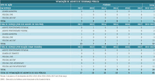 O período de maior mortandade varia conforme o tipo de execução/vitimização. Por exemplo, o ano de 2012 houveram a maioria das mortes de agentes em serviço (3), assim como o maior número de mortes de agentes fora de serviço devido á função (13). Depois disso, 2013 aparece com 7 vítimas deste último tipo, caindo mais ainda até 2017, que num período curo, passou a ter 5 CVLIs de agentes de segurança.