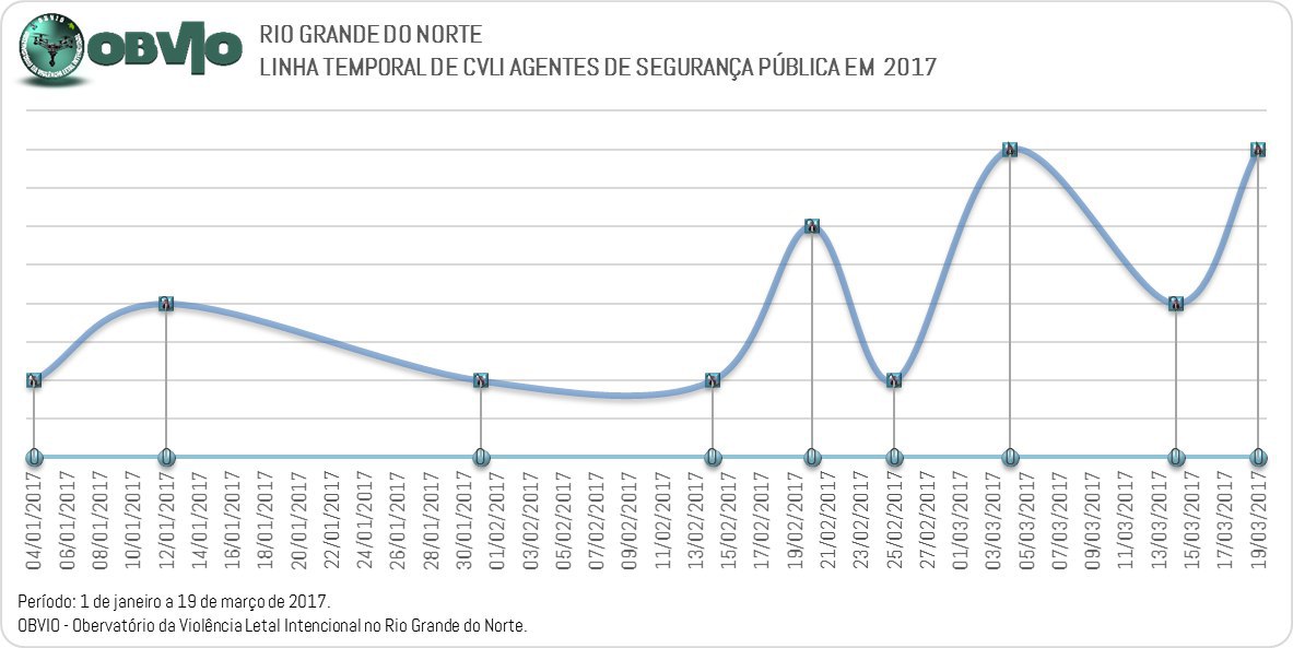 O OBVIO – Observatório da Violência Letal Intencional do RN, apresenta um relatório parcial de CVLIs, no período compreendido entre 1 de janeiro a 19 de março de 2017 comparado ao mesmo período dos anos de 2015 e 2016, no que se referem aos agentes de segurança pública (policiais e afins) vitimados no Rio Grande do Norte.