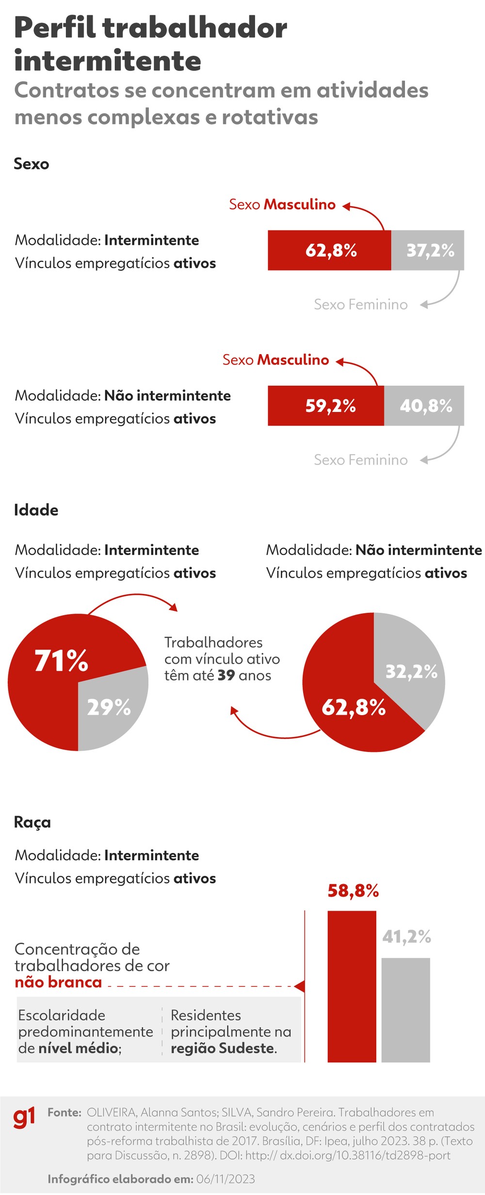 Com base nos dados da Relação Anual de Informações Sociais (Rais) e do Cadastro Geral de Empregados e Desempregados (Caged e Novo Caged), para o período entre 2017 (promulgação da Lei no 13.467/2017) até 2021, o panorama feito pelo Ipea do contrato de trabalho intermitente no Brasil envolve as seguintes características: