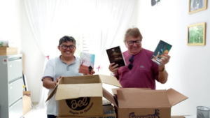O colaborador Eriberto Monteiro e o presidente Wellington Barreto, organizando livros para exposição na Câmara municipal de Mossoró.