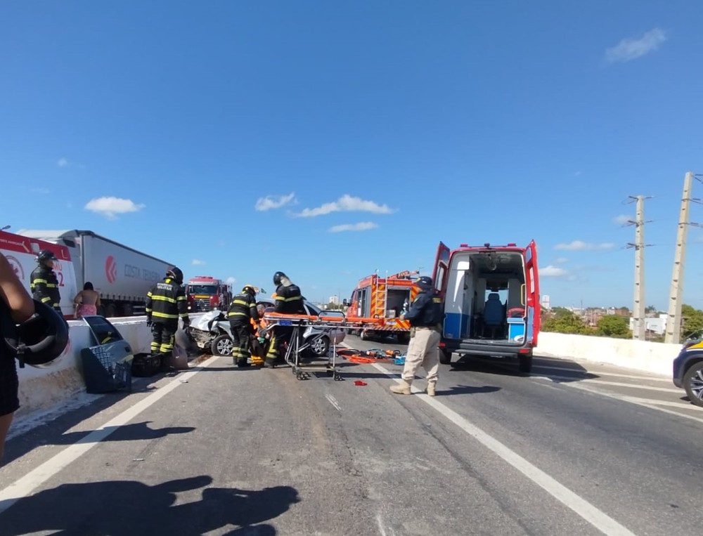 O motorista do carro que estava atrás ficou preso às ferragens e, em estado grave, foi socorrido pela Unidade de Resgate do Corpo de Bombeiros, que realizou o desencarceramento e o transporte da vítima ao Hospital Regional Tarcísio Maia.