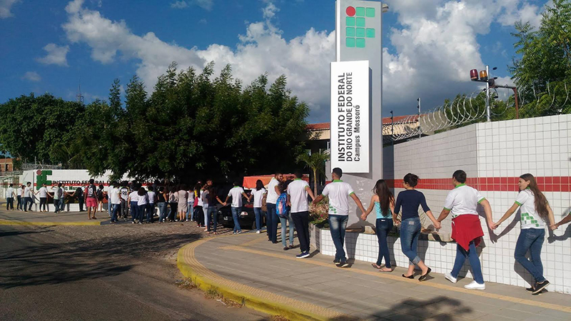 Contra o corte de verbas para os Institutos Federais, estudantes e servidores do Instituto Federal de Educação, Ciência e Tecnologia do Rio Grande do Norte (IFRN), Campus Mossoró, realizaram um “abraço simbólico” em frente à instituição na manhã desta quarta-feira, 16. O protesto visa combater a portaria 28/2017 do Ministério da Educação, que estabelece o corte de 20% da verba destinada aos IFs.