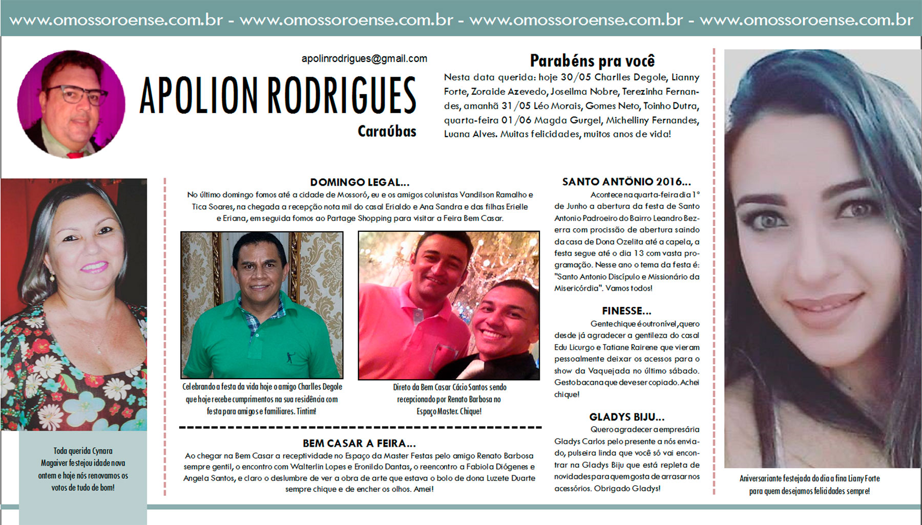Nesta data querida: hoje 30/05 Charlles Degole, Lianny Forte, Zoraide Azevedo, Joseilma Nobre, Terezinha Fernandes, amanhã 31/05 Léo Morais, Gomes Neto, Toinho Dutra, quarta-feira 01/06 Magda Gurgel, Michelliny Fernandes, Luana Alves. Muitas felicidades, muitos anos de vida!