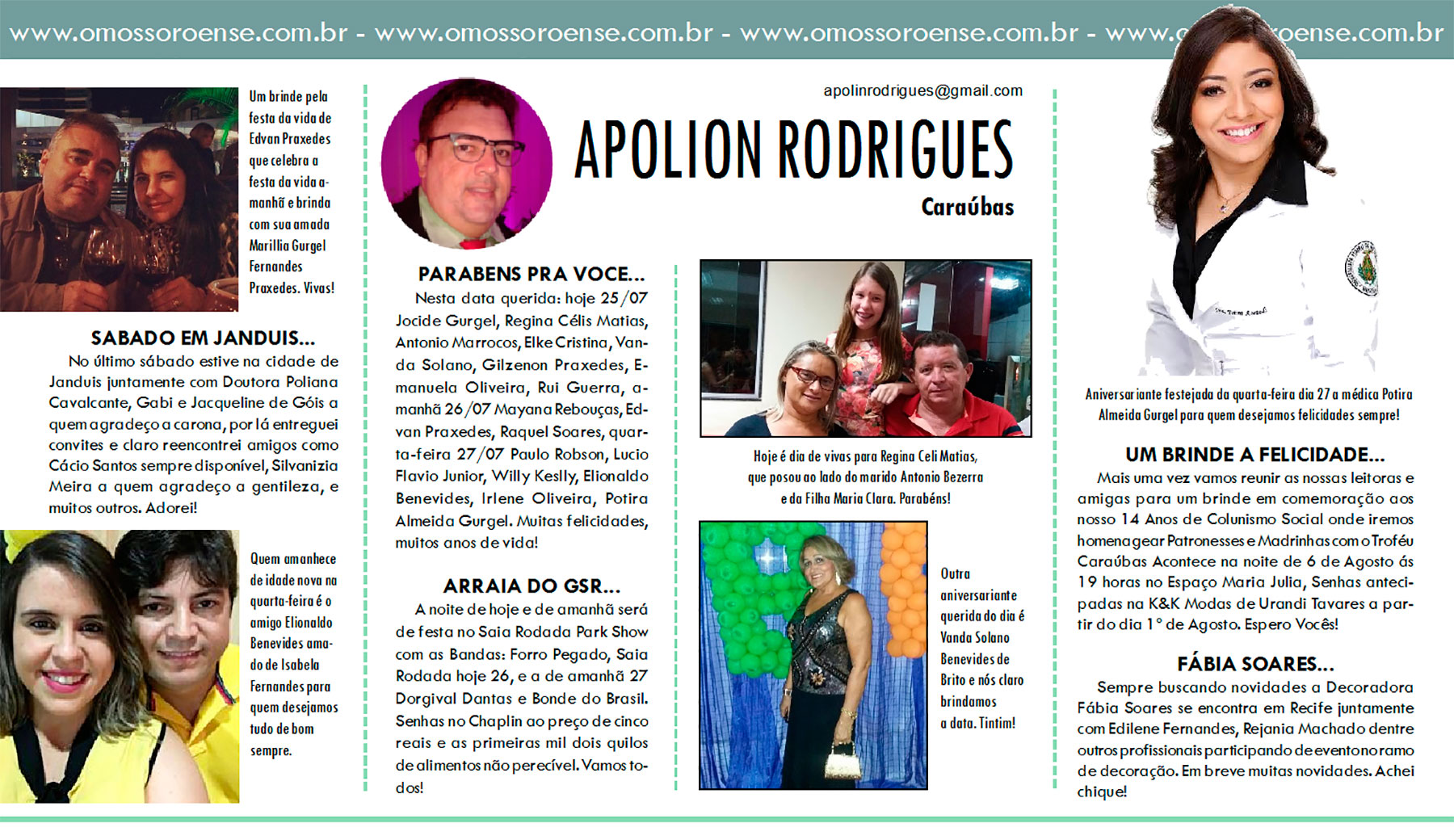 Nesta data querida: hoje 25/07 Jocide Gurgel, Regina Célis Matias, Antonio Marrocos, Elke Cristina, Vanda Solano, Gilzenon Praxedes, Emanuela Oliveira, Rui Guerra, amanhã 26/07 Mayana Rebouças, Edvan Praxedes, Raquel Soares, quarta-feira 27/07 Paulo Robson, Lucio Flavio Junior, Willy Keslly, Elionaldo Benevides, Irlene Oliveira, Potira Almeida Gurgel. Muitas felicidades, muitos anos de vida!