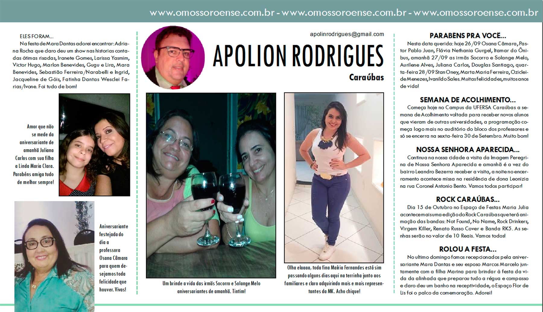 Nesta data querida: hoje 26/09 Osana Câmara, Pastor Pablo Juan, Flávia Nethania Gurgel, Itamar do Ônibus, amanhã 27/09 as irmãs Socorro e Solange Melo, Aurilene Alves, Juliana Carlos, Douglas Santiago, quarta-feira 28/09 Stan Oney, Marta Maria Ferreira, Ozicleide Menezes, Ivanildo Sales. Muitas felicidades, muitos anos de vida!