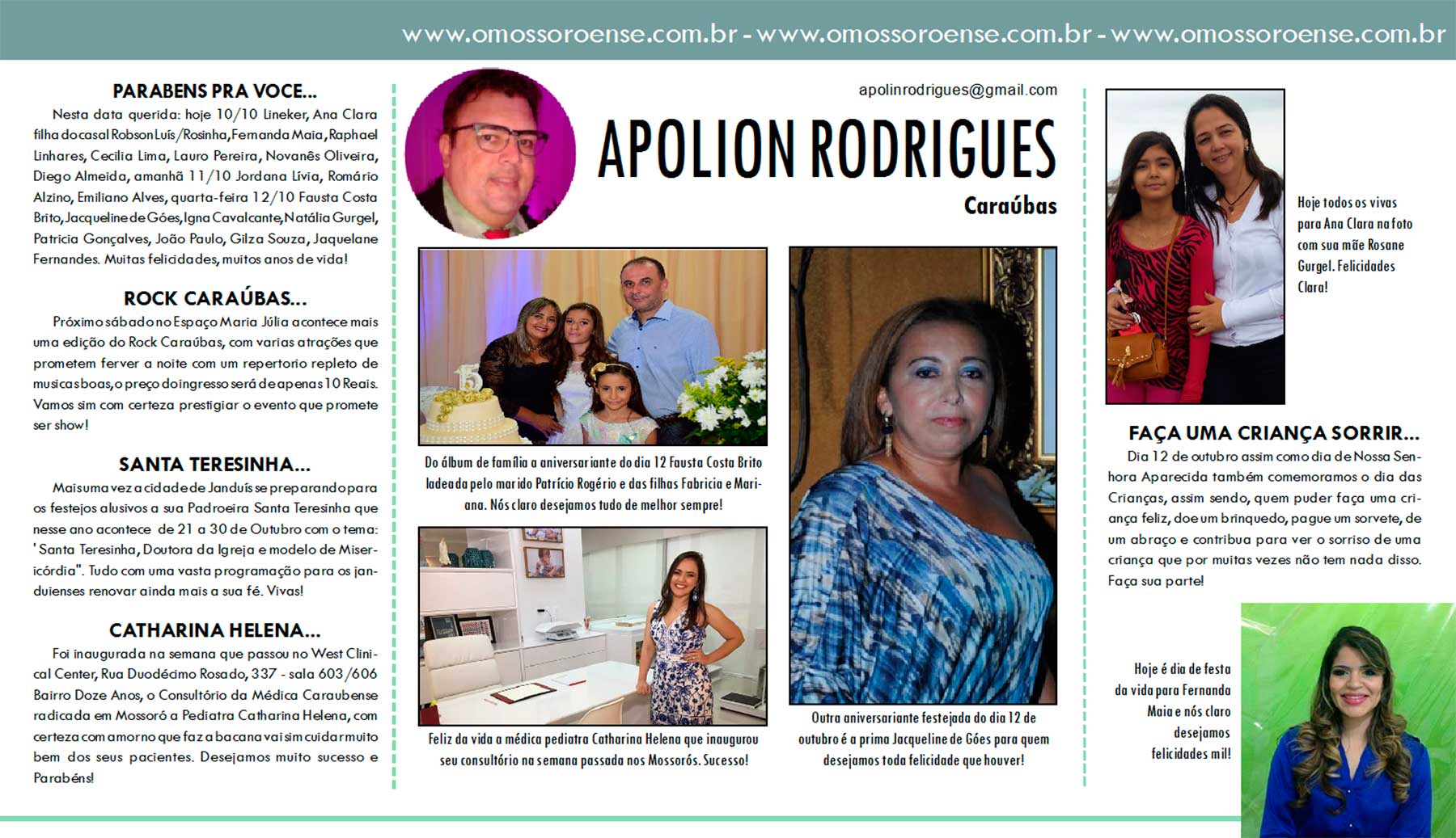 Nesta data querida: hoje 10/10 Lineker, Ana Clara filha do casal Robson Luís/Rosinha, Fernanda Maia, Raphael Linhares, Cecilia Lima, Lauro Pereira, Novanês Oliveira, Diego Almeida, amanhã 11/10 Jordana Lívia, Romário Alzino, Emiliano Alves, quarta-feira 12/10 Fausta Costa Brito, Jacqueline de Góes, Igna Cavalcante, Natália Gurgel, Patricia Gonçalves, João Paulo, Gilza Souza, Jaquelane Fernandes. Muitas felicidades, muitos anos de vida!