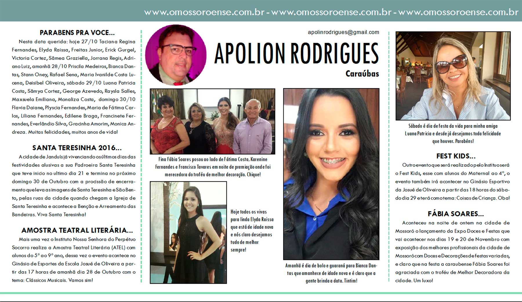 Nesta data querida: hoje 27/10 Taciana Regina Fernandes, Elyda Raissa, Freitas Junior, Erick Gurgel, Victoria Cortez, Sâmea Graziella, Jorrana Regis, Adriano Luiz, amanhã 28/10 Priscila Medeiros, Bianca Dantas, Stann Oney, Rafael Sena, Maria Ivanilde Costa Lucena, Deisibel Oliveira, sábado 29/10 Luana Patricia Costa, Sâmya Cortez, George Azevedo, Raysla Salles, Maxsuela Emiliana, Monaliza Costa, domingo 30/10 Flavia Daiane, Plyscia Fernandes, Maria de Fátima Carlos, Liliana Fernandes, Edilene Braga, Francinete Fernandes, Everlândio Silva, Gracinha Amorim, Monica Andreza. Muitas felicidades, muitos anos de vida!