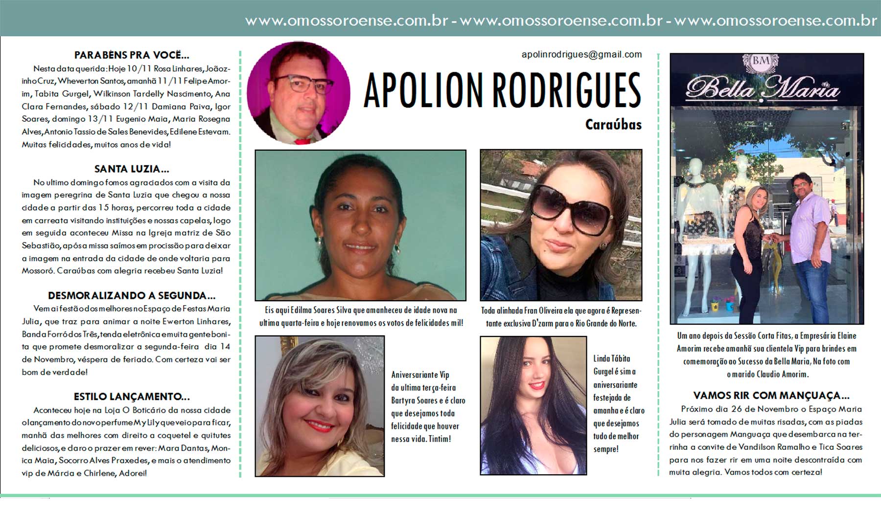 Nesta data querida: Hoje 10/11 Rosa Linhares, Joãozinho Cruz, Wheverton Santos, amanhã 11/11 Felipe Amorim, Tabita Gurgel, Wilkinson Tardelly Nascimento, Ana Clara Fernandes, sábado 12/11 Damiana Paiva, Igor Soares, domingo 13/11 Eugenio Maia, Maria Rosegna Alves, Antonio Tassio de Sales Benevides, Edilene Estevam. Muitas felicidades, muitos anos de vida!