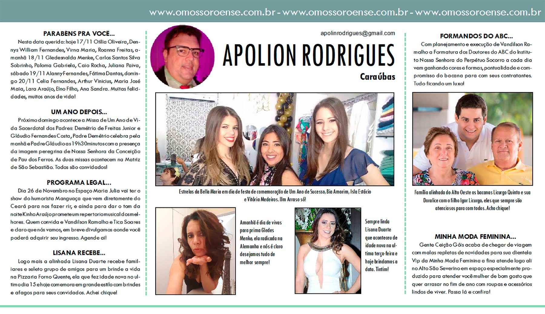 Nesta data querida: hoje 17/11 Otília Oliveira, Dennys William Fernandes, Virna Maria, Roanna Freitas, amanhã 18/11 Gledesnalda Menke, Carlos Santos Silva Sobrinho, Paloma Gabriela, Caio Rocha, Juliana Paiva, sábado 19/11 Alanny Fernandes, Fátima Dantas, domingo 20/11 Celia Fernandes, Arthur Vinicius, Maria José Maia, Lara Araújo, Elno Filho, Ana Sandra. Muitas felicidades, muitos anos de vida!
