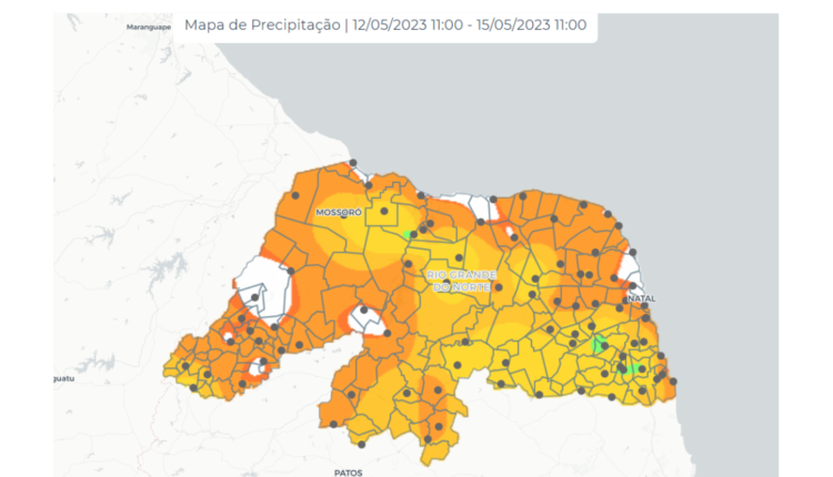 Após um período de veranico, fenômeno que interrompe a continuidade de chuvas durante a estação chuvosa, o Sistema de Monitoramento da Empresa de Pesquisa Agropecuária do Rio Grande do Norte, (Emparn) registrou chuvas em todas as regiões do estado durante o final de semana. Os maiores acumulados, entre às 7h da sexta-feira (12) e o mesmo horário desta segunda-feira (15), ocorreram nos municípios de Lagoa Salgada (Agreste Potiguar), 71,6mm; Montanhas (Leste Potiguar), 68mm e Carnaubais (Oeste Potiguar), 60,8mm.