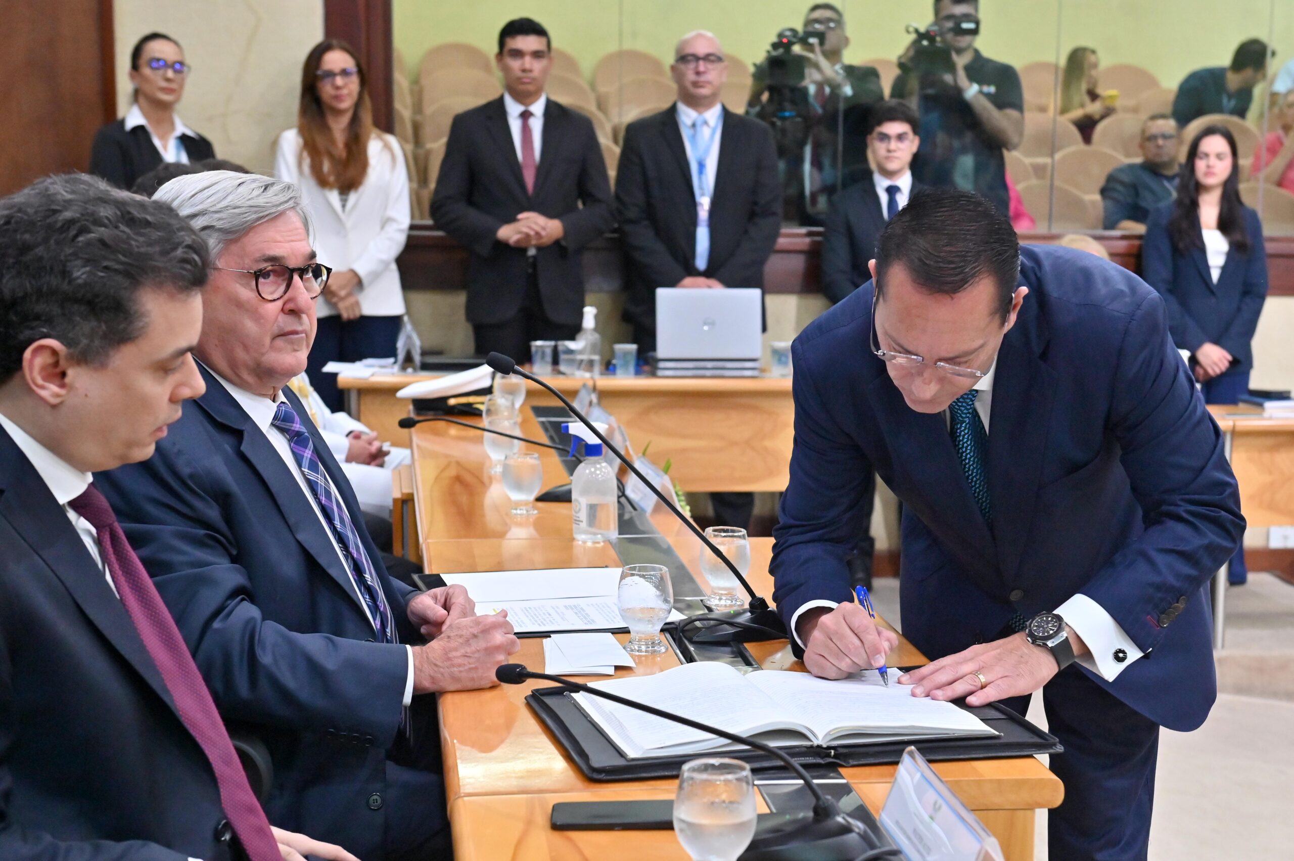 O parlamentar e os colegas que comporão a mesa diretora para o biênio 2025-2027 assinaram o termo de posse. Em seguida, o presidente da Casa fez um breve discurso no qual agradeceu a confiança dos seus pares e servidores.