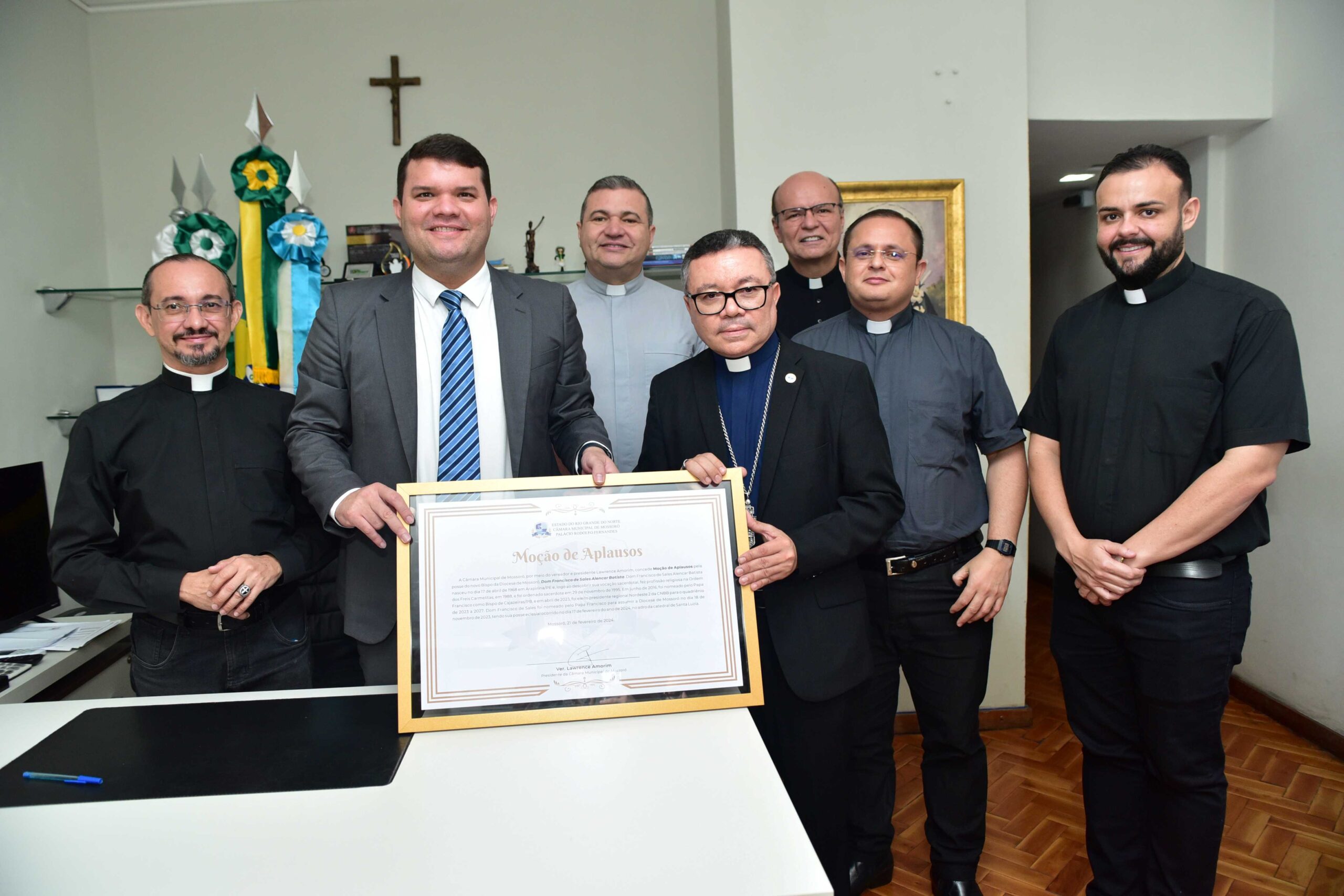 Aprovada no plenário, por unanimidade, a homenagem foi entregue pelo presidente da Casa, Lawrence Amorim (PSDB). Acompanharam dom Francisco na Câmara os padres Flávio Augusto Forte Melo, Heriberto Carneiro, Ricardo Rubens e Demétrio Júnior. O compromisso compõe a agenda de visitas institucionais do bispo.