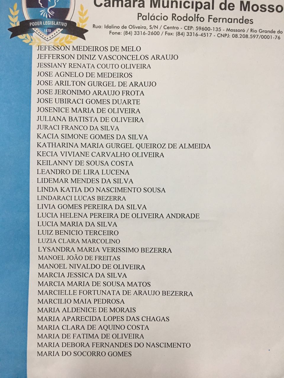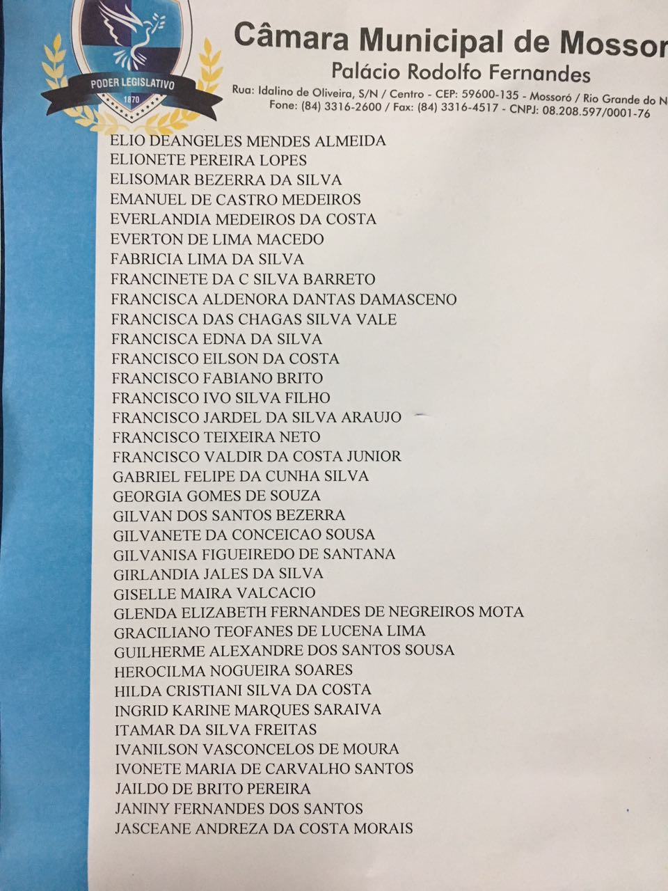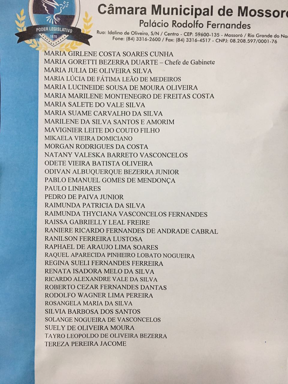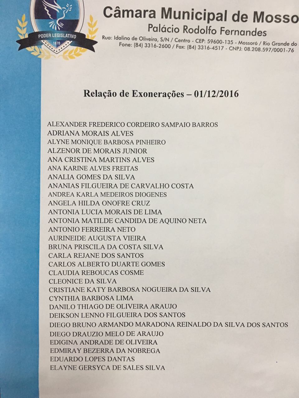 A Câmara Municipal de Mossoró (CMM) publicou nesta quinta-feira, 1º de dezembro, uma lista com os nomes de 143 pessoas exoneradas. As cinco folhas contendo os nomes do assessores exonerados foram pregadas em um mural na CMM.