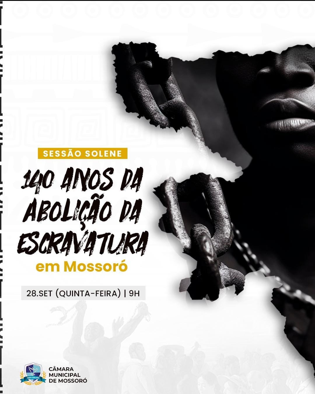 A Câmara Municipal de Mossoró vai realizar uma sessão solene em comemoração aos 140 anos da abolição da escravatura em Mossoró. A solenidade será realizada na quinta-feira, 28 de setembro, às 9h, no plenário da Casa.