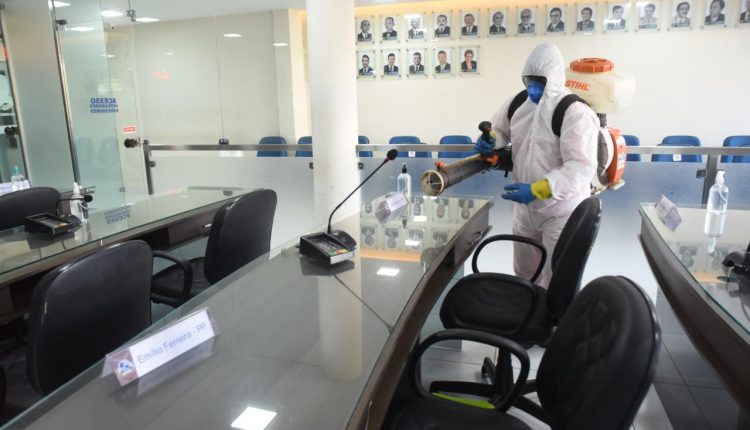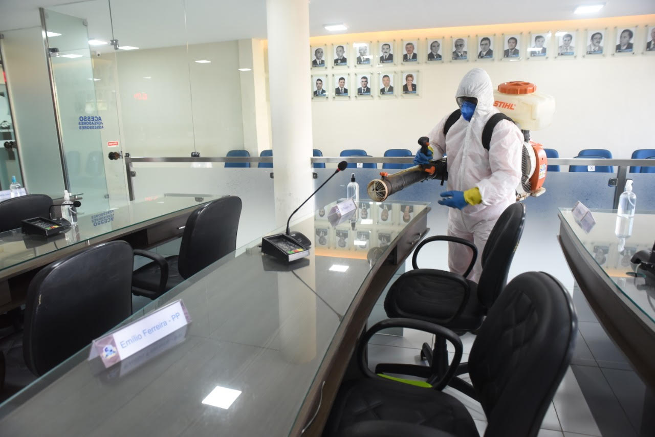 Nesta segunda-feira (23), houve a higienização por empresa especializada e produtos adequados nos ambientes de uso coletivo – recepção, plenário, banheiros e gabinetes.