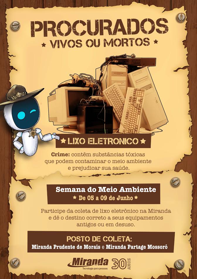 Em comemoração à Semana do Meio Ambiente, a Miranda Computação irá abrir postos de coleta de lixo eletrônico nas cidades de Mossoró e Natal. Até o dia 09 de junho, a loja da Miranda na Avenida Prudente de Morais e a loja Miranda do Partage Shopping Mossoró atuarão como posto de coleta para quem desejar se livrar do lixo eletrônico acumulado em casa.