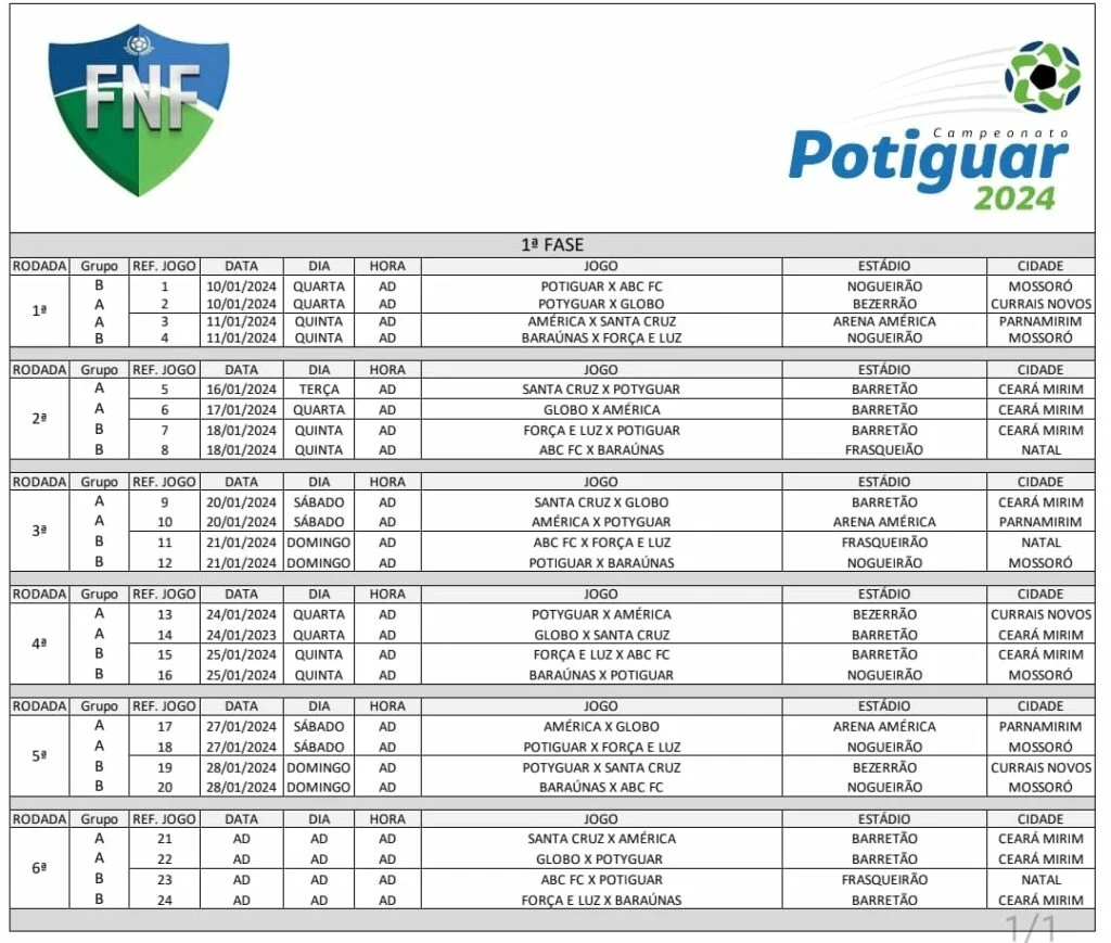 O departamento técnico da Federação Norte-Rio-Grandense de Futebol publicou, nesta quinta-feira (28), as datas e locais dos jogos da primeira fase do Campeonato Potiguar 2024. A competição terá início no próximo dia 10 de janeiro.