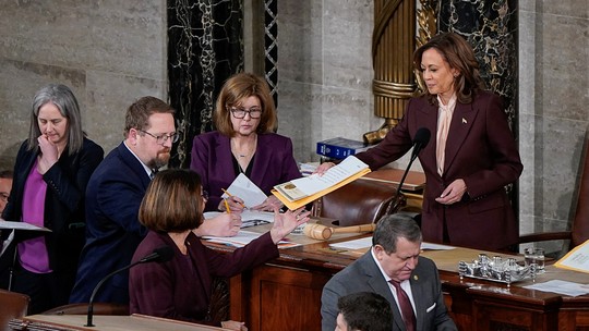 O Congresso dos Estados Unidos certificou, nesta segunda-feira (6), a vitória de Donald Trump nas eleições presidenciais de novembro de 2024. A cerimônia foi conduzida pela vice-presidente Kamala Harris, que também preside o Senado e foi derrotada por Trump na disputa.
