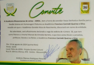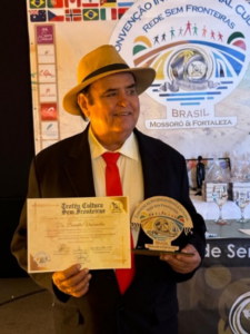 Prof. Benedito Vasconcelos Mendes sendo homenageado com Diploma e Comenda pela Rede Sem Fronteiras, por ocasião do Baile de Gala, no encerramento da Convenção Internacional Cultural da Rede Sem Fronteiras, ocorrido nas cidades de Mossoró e Fortaleza. 25-08-2024.