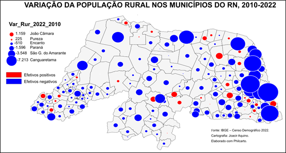 A queda de participação relativa da população do campo no RN reflete o movimento conhecido como êxodo rural. Com efeito, entre 2010 e 2022, dos 167 municípios norte-rio-grandenses, apenas 32 registraram algum crescimento da população rural. Nos demais 135 municípios, entretanto, o êxodo rural foi marcante, resultando em uma perda de 107.960 pessoas, o que significou uma variação média negativa de -15,4% no período de 2010 a 2022.