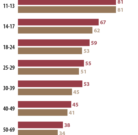 A relação com o livro muda ainda com a idade: as crianças (de 5 a 13 anos) são as que mais gostam de ler (87%), enquanto a população acima de 50 anos demonstra menor apreço pela leitura (57%). Segundo os entrevistados na pesquisa, a principal motivação para ler é o gosto pessoal, seguido por distração e busca por conhecimento, enquanto a obrigação (escolar ou profissional) aparece com pouca relevância.