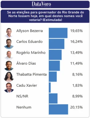 A pesquisa DataVero aponta cenário competitivo e novos elementos à sucessão estadual no Rio Grande do Norte. O levantamento avaliou intenções de voto para o Governo em diferentes cenários e revelou que Carlos Eduardo, ex-prefeito de Natal e tradicional liderança da família Alves, aparece bem posicionado em todos os cenários, disputando diretamente com Allyson Bezerra (UB). Rogério Marinho, com atuação nacional como ex-ministro e senador, mantém um eleitorado expressivo. Álvaro Dias, também ex-prefeito da capital, também aparece.