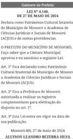 ACJUS para o nosso corpo acadêmico e a coletividade Mossoroense e Nacional, a Academia de Ciências Jurídicas e Sociais de Mossoró – ACJUS, ontem deu mais um passo importante no ciclo de registros culturais e Sociais perante as autoridades públicas em Mossoró. Se antes já reconhecida de utilidade pública perante o estado e o município, agora também somos patrimônio histórico e cultural imaterial. Bom se registrar que a nossa sede, palácio Cultural Acadêmico Milton Marques de Medeiros é declarado patrimônio histórico e cultural no âmbito do Rio Grande do Norte e do Município de Mossoró. Também registramos que desde 2016 temos registro no Ministério da Cultura e que o PCAMMM é recomendado pelo Ministério da Cultural como equipamento a ser visitado em Mossoró dada a sua contribuição cultural e as fontes de pesquisa. Lei número 4.140 de 27 de maio de 2024, sancionada e publicada ontem no Diário oficial do Município de Mossoró. No gênero e talvez umas das poucas na América Latina a ter uma essa certificação. Parabéns para ACJUS. Parabéns para o nosso corpo acadêmico. Parabéns, Mossoró por mais um pioneirismo.