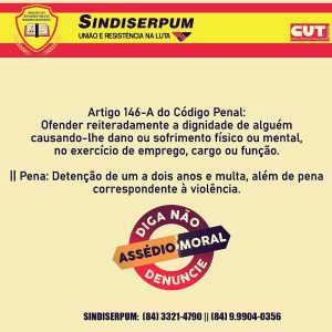 “É uma prática nociva que o Sindicato dos Servidores Públicos Municipais de Mossoró vai continuar combatendo com veemência e firmeza. A campanha servirá para que, tomando conhecimento dos casos, possamos acolher os servidores, agir e coibir este crime que, infelizmente tem se tornado cada vez mais evidente em Mossoró e adoecido os servidores públicos municipais”. Comenta a presidente do Sindiserpum, Eliete Vieira.