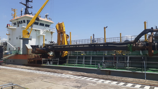 A draga que será usada na obra de engorda da praia de Ponta Negra, principal cartão postal de Natal, chegou à capital potiguar na quarta-feira (28). A empresa responsável pelo serviço está na fase de conclusão da montagem das tubulações que serão usadas para transportar a areia do navio para a costa.