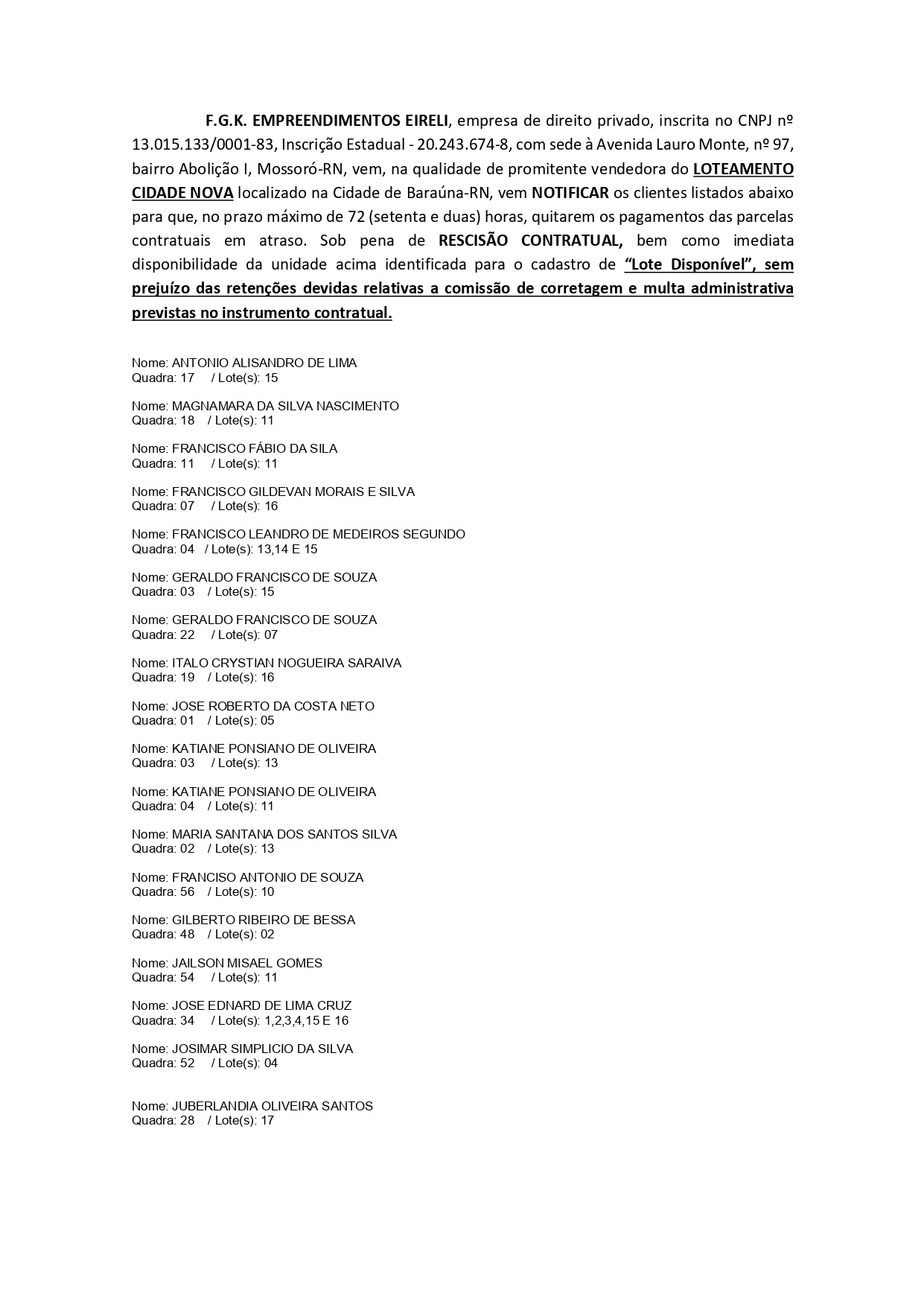 InícioEditaisEdital F.G.K Empreeendimentos Eireli Editais Edital F.G.K Empreeendimentos Eireli By Luan Fernando 31 de janeiro de 2022 0 7 Compartilhado FacebookTwitterPinterestWhatsAppCopy URL Compartilhado FacebookTwitterPinterestWhatsAppCopy URL Artigo anteriorVacinação contra covid-19 na Faculdade de Enfermagem da Uern terão dias específicosPróximo artigoDeputado Ezequiel Ferreira deverá disputar o Governo do Estado Luan Fernando NOTÍCIAS RELACIONADAS Editais CONDOMINIO VERONIQUE – CONSELHO ADMINISTRATIVO – EDITAL 01/2026 19 de janeiro de 2026 Editais EDITAL DE CONVOCAÇÃO DA ASSEMBLEIA GERAL EXTRAORDINÁRIA – A.G.E. 19 de janeiro de 2026 Editais EDITAL DE CONVOCAÇÃO DE ASSEMBLEIA GERAL ORDINÁRIA (AGO) – ASSOCIAÇÃO CULTURAL ESPORTE CLUBE BARAÚNAS 12 de dezembro de 2025 DEIXE UMA RESPOSTA Cancelar resposta Comentário: Por favor digite seu comentário! Nome:* Por favor, digite seu nome aqui E-mail:* Você digitou um endereço de e-mail incorreto! Por favor, digite seu endereço de e-mail aqui Site: Salve meu nome, e-mail e site neste navegador para a próxima vez que eu comentar. Captcha verification failed! Falha na pontuação do usuário captcha. Por favor, entre em contato conosco! - Advertisment - Notícias Recentes Uern registra recorde de inscrições no Sisu e se consolida entre as universidades mais procuradas do Nordeste 29 de janeiro de 2026 Mercado de trabalho do RN fecha 2025 com saldo positivo de quase 16 mil empregos formais 29 de janeiro de 2026 Emater em Mossoró mobiliza coordenadores dos bancos de sementes para dar início à distribuição 29 de janeiro de 2026 RN tem 127 cidades em situação de emergência pela seca, maior número do Nordeste 29 de janeiro de 2026 Com apoio do Governo do Estado, RN recebe três modalidades do Campeonato Brasileiro de Ginástica 29 de janeiro de 2026 Carregar mais