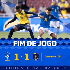 Brasil e Equador empataram em 1 a 1 no final da tarde desta quinta-feira (27) em jogo válido pela 15ª rodada das Eliminatórias Sul-Americanas para a Copa do Mundo do Catar. A partida foi disputada no Estádio Casa Blanca em Quito. Mesmo sem a presença do craque Neymar, o time do técnico Tite aproveitou logo a primeira chance e abriu o placar aos cinco minutos de jogo.