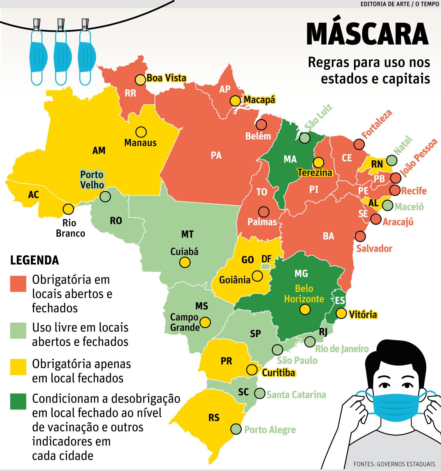 Nove Estados brasileiros e o Distrito Federal desobrigaram o uso de máscara em ambientes abertos ou fechados, e nove capitais também seguiram o movimento. Agora, somente sete capitais brasileiras – Aracaju, Belém, Fortaleza, João Pessoa, Recife, Salvador e Palmas – mantêm a obrigatoriedade do uso de máscara em qualquer ambiente. A tendência, como tem-se comprovado com a publicação de decretos ao longo deste mês, é que o uso do item de segurança seja cada vez mais flexibilizado, mas especialistas recomendam que, em algumas situações, os cidadãos ainda escolham utilizar a máscara mesmo sem a exigência oficial.