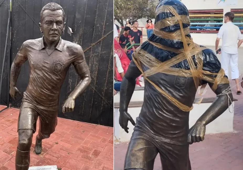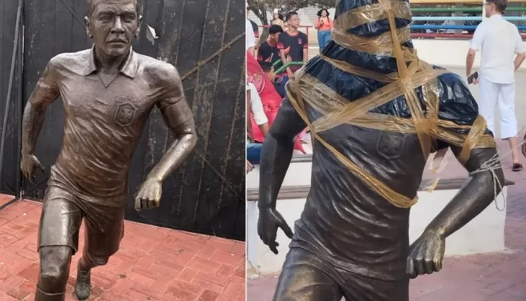 Uma estátua em homenagem ao lateral-direito Daniel Alves, ex-Barcelona e Seleção Brasileira, foi vandalizada, nesta quinta-feira (7), em Juazeiro, no interior da Bahia. Fitas adesivas e uma sacola de lixo foram colocadas sobre a cabeça da escultura.