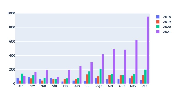 Evolução mensal da exportação de tilápia (todos os formatos) | 2018 – 2021