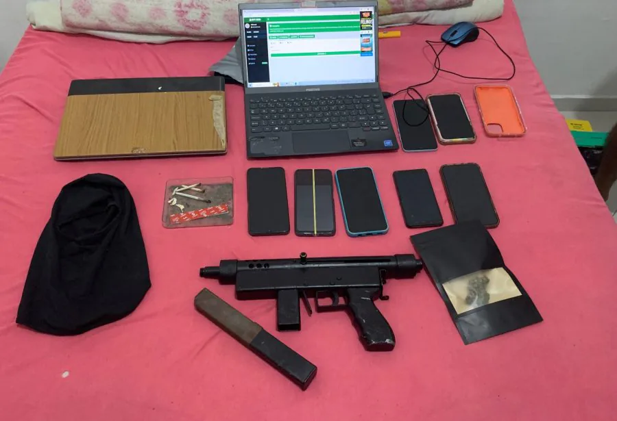 Durante a busca, o suspeito foi surpreendido em posse de diversos aparelhos celulares, notebook e chips de linhas telefônicas, uma balaclava, porções de drogas e uma balança de precisão. Além dos dispositivos que seriam utilizados nas fraudes, o investigado também portava uma submetralhadora , razão pela qual ele foi autuado em flagrante pela suspeita da prática dos crimes de receptação, tráfico de drogas e posse irregular de arma de fogo.