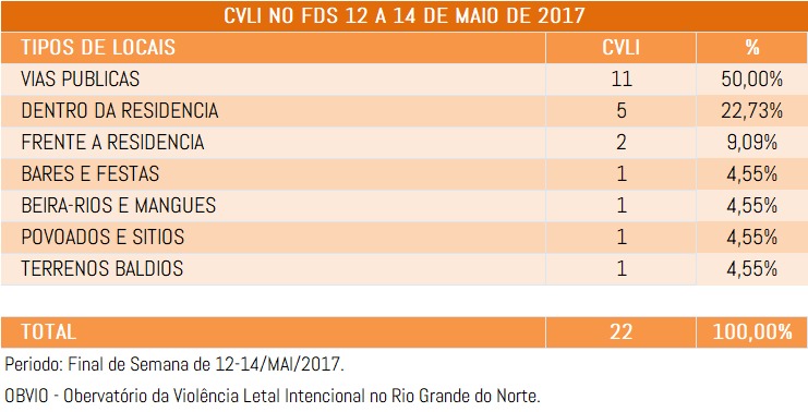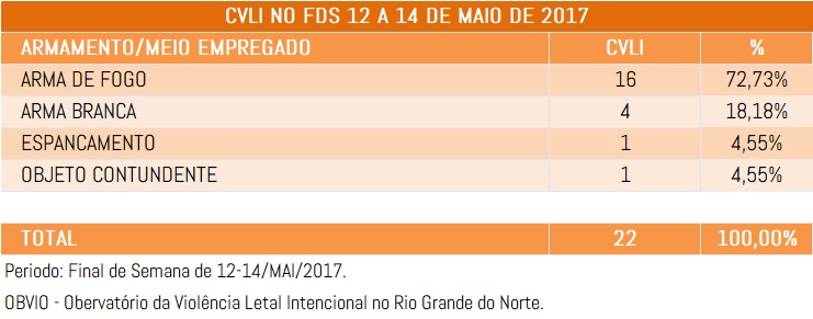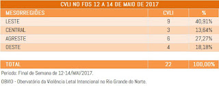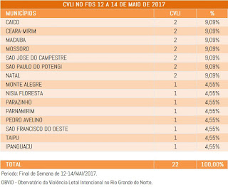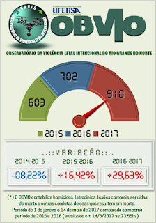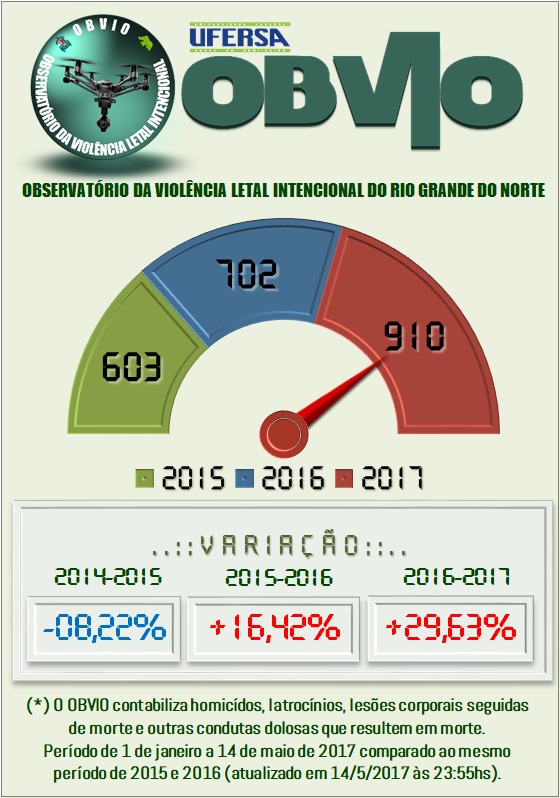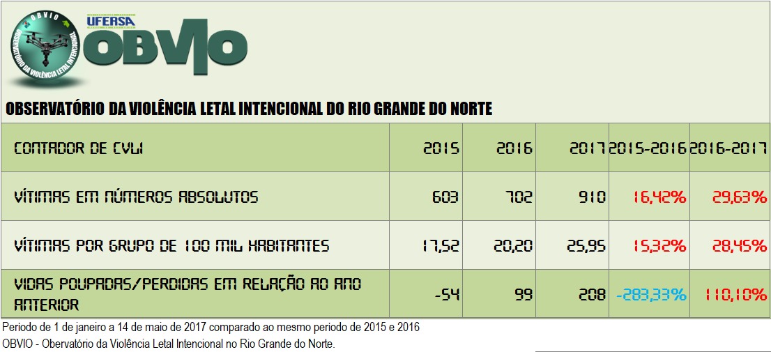 O OBVIO – Observatório da Violência Letal Intencional do RN, apresenta uma nova atualização de CVLIs, no período compreendido entre 1 de janeiro a 14 de maio de 2017 comparado ao mesmo período dos anos de 2015 e 2016.