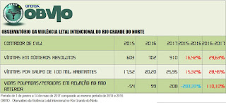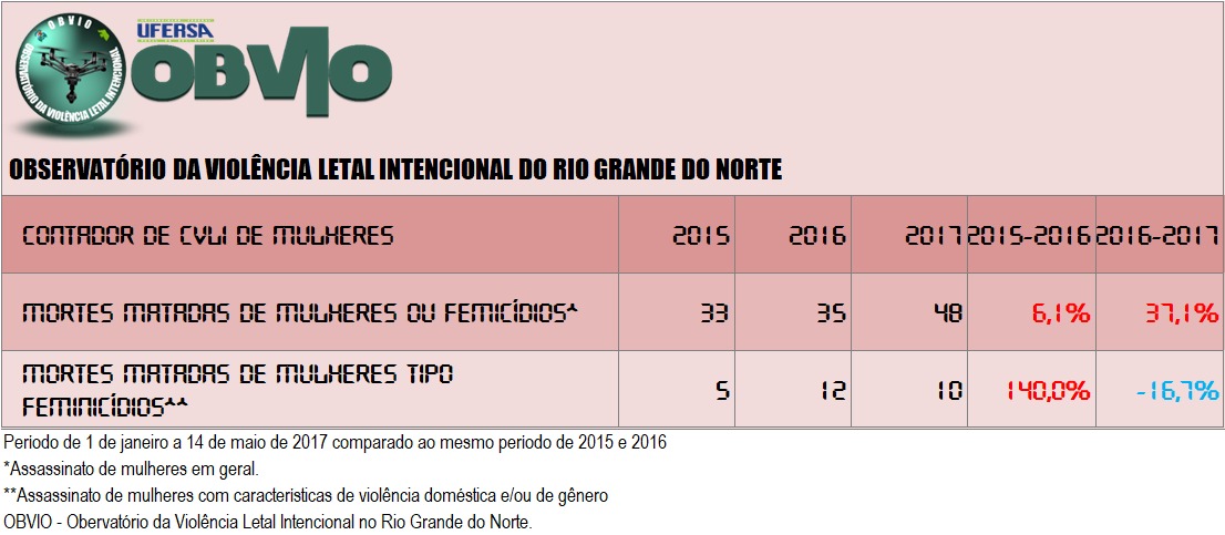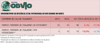 Até domingo (14/05/2017) foram 48 femicídios no ano de 2017 no RN, 35 em 2016 e 33 em 2015 no comparativo com o mesmo período. Quanto aos “feminicídios”, foram 10 em 2017 (sendo um ocorrido neste FDS), contra 12 em 2015 e 5 em 2014, também no comparativo do mesmo período.