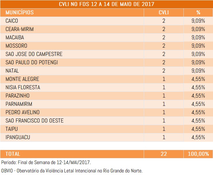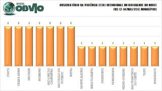 Municípios que registraram 1 CVLI (4,55% cada um) cada foram: Monte Alegre, Nísia Floresta, Parazinho, Parnamirim, Pedro Velho, São Francisco do Oeste (feminicídio), Ipanguaçu e Taipu.