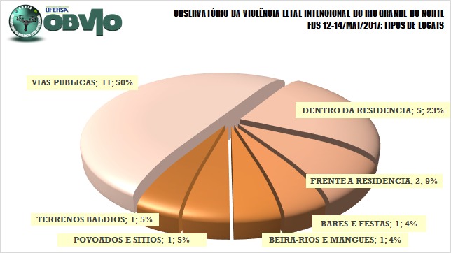 Nos locais onde ocorreram os CVLIS neste último final de semana, tivemos: 11 em vias públicas (50%); 5 dentro de residências (22,73%); 2 em frente à residências (9,09%). As demais, contaram com 1 ocorrências cada: bares e festas (4,55%); bares e festas (4,55%) beira-rios e mangues (4,55%); povoados e sítios (4,55%); e terrenos baldios (4,55%).