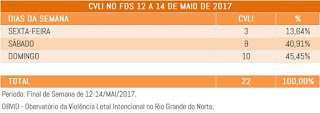 O RN contabiliza mais um fim de semana violento. No cômputo geral, até o fim da noite de ontem (14/05/2017) foram 910 CVLIs no RN. Os dados apontam para um aumento de 29,63% em relação a 2016. Os dados absolutos demonstram 207 mortes violentas a mais que no ano passado no mesmo período. Em 2016, até o mesmo período, foram 702 CVLIs, contra 603 em 2015.