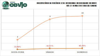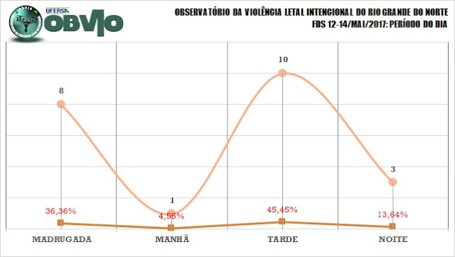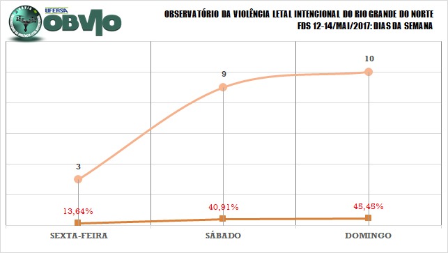 Os dias mais violentos foram, respectivamente, Domingo com 10 ocorrências (45,45% do total) e o Sábado com 9 CVLIs (20,91% do total), seguidos da Sexta-Feira com 3 CVLIs (13,64% no período).