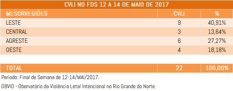 A dinâmica da violência elenca fatores que têm levado a concentração de CVLI no Leste Potiguar já foram amplamente divulgados por este Observatório em diversos relatórios, que desta feita foi responsável por 41% dos homicídios do final de semana (9 do total), seguida pelo Agreste Potiguar com 6 ocorrências (27% do total). As regiões Oeste Potiguar e a região Central Potiguar, contabilizaram respectivamente 4 e 3 CVLIs cada um (18% e 14% do total cada uma).